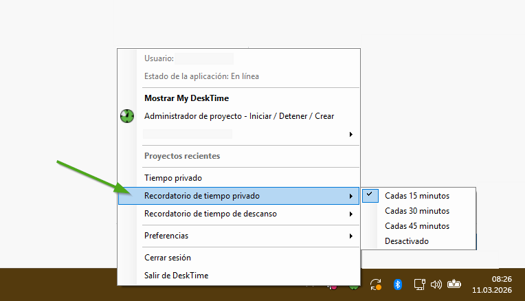 Haz clic derecho en el icono, desplázate hasta Recordatorio de tiempo privado y desmarca el intervalo de tiempo que esté activo.