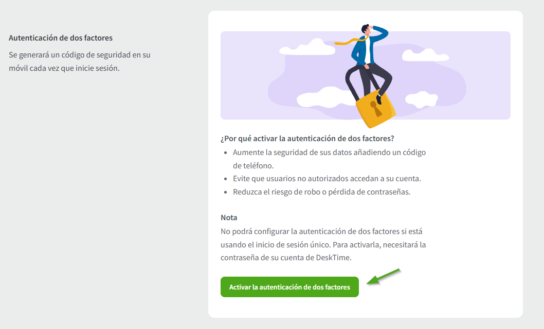 - Atención: no es posible configurar la autenticación de dos factores en DeskTime si inicia sesión con el inicio de sesión único. Para ello necesitará una contraseña de cuenta de DeskTime.