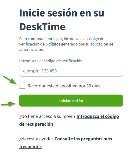 Si marca la opción Confiar en este dispositivo durante 30 días, DeskTime no le pedirá el código de verificación durante 30 días.