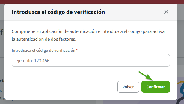 - Ingrese el código de verificación de 6 dígitos que generó su aplicación de autenticación y haga clic en Confirmar.