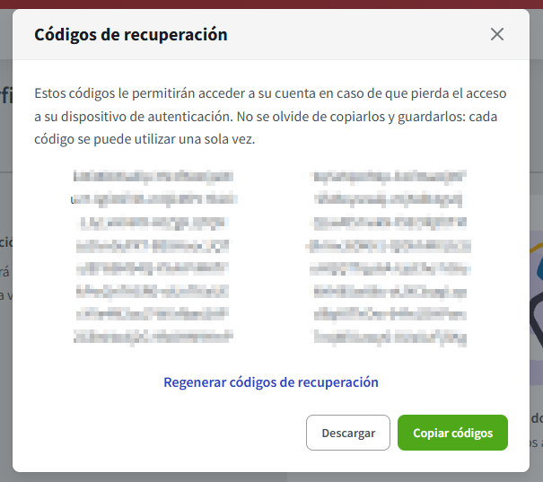 Asegúrese de copiar y guardar los códigos en un lugar seguro.