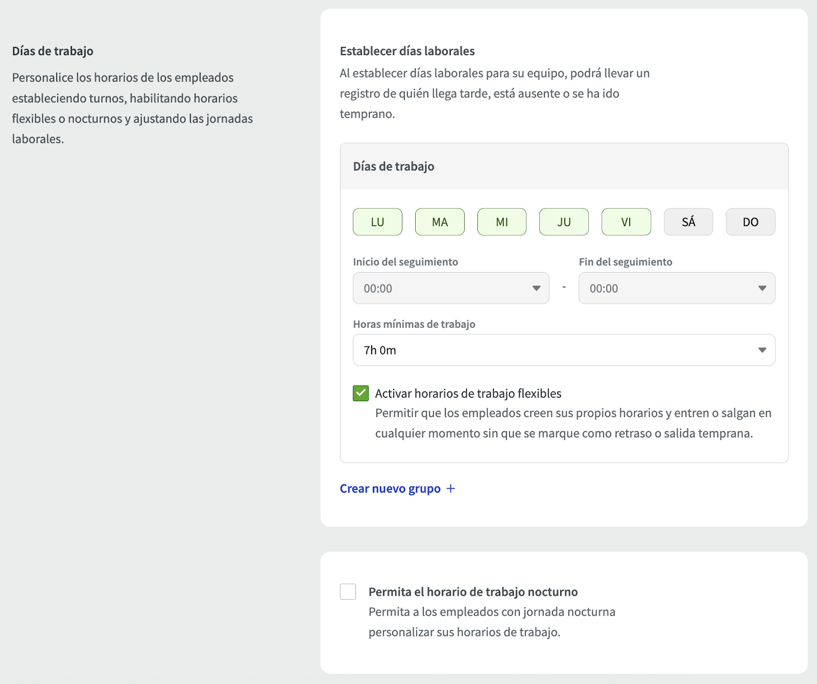 - Use Crear un nuevo grupo si el horario de trabajo difiere en diferentes días de la semana.