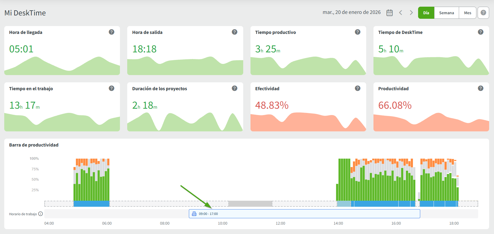 Los usuarios de DeskTime pueden configurar días laborables predeterminados, así como días de seguimiento predeterminados. Los días laborables se usan para llevar un registro del horario de todos, tanto si llegan tarde, faltan al trabajo o salen antes. Por otro lado, los días de seguimiento se usan para configurar una agenda cuando se permite el seguimiento automático del tiempo y la actividad de los usuarios.