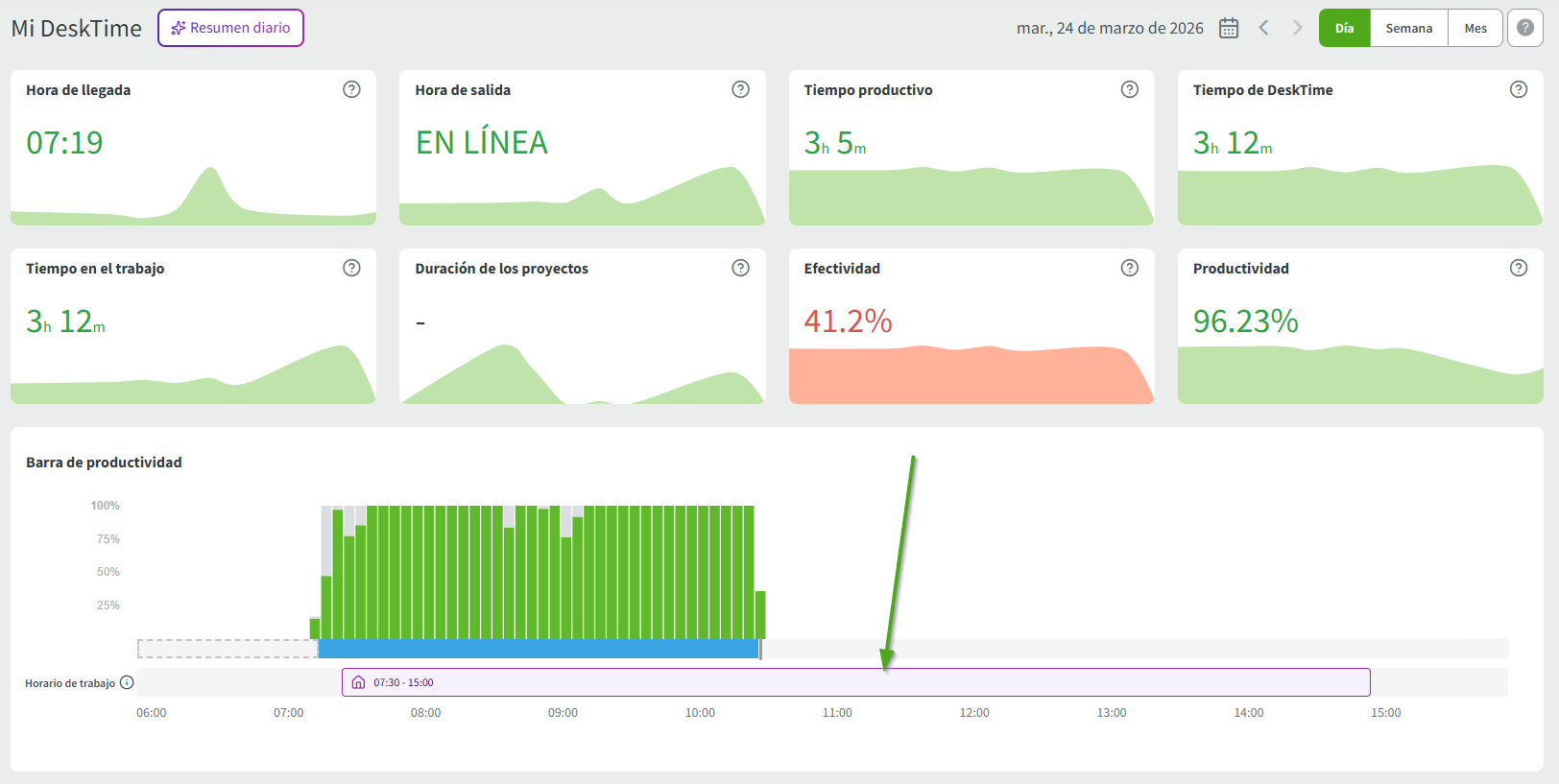 El seguimiento manual del tiempo es posible independientemente de la hora y los días establecidos en Días de seguimiento.
