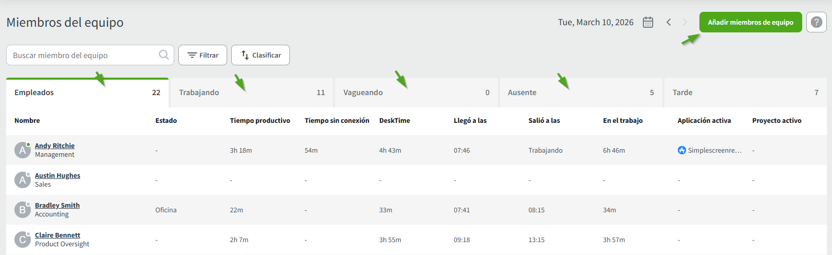 La sección Miembros del equipo ofrece información en tiempo real sobre la actividad de su equipo. Todos los usuarios pueden accederla, excepto los empleados.