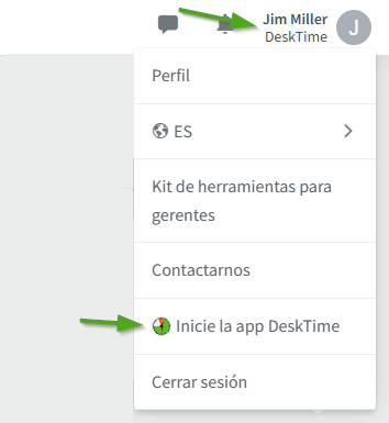 2. Puede iniciar sesión a través de su página web de DeskTime utilizando la opción "Inicie la app DeskTime". Eso conectará e iniciará la aplicación de escritorio. Puede encontrar la función en el menú desplegable haciendo clic en el icono de su nombre en la esquina superior derecha de la página.