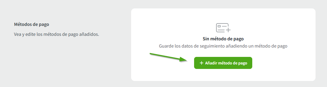 Para añadir un método de pago, vaya a Ajustes > Facturación > Datos de facturación > Métodos de pago.