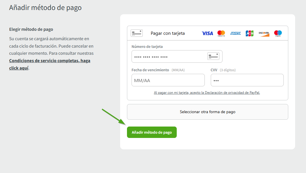 Introduzca los datos de pago y haga clic en Añadir método de pago.
