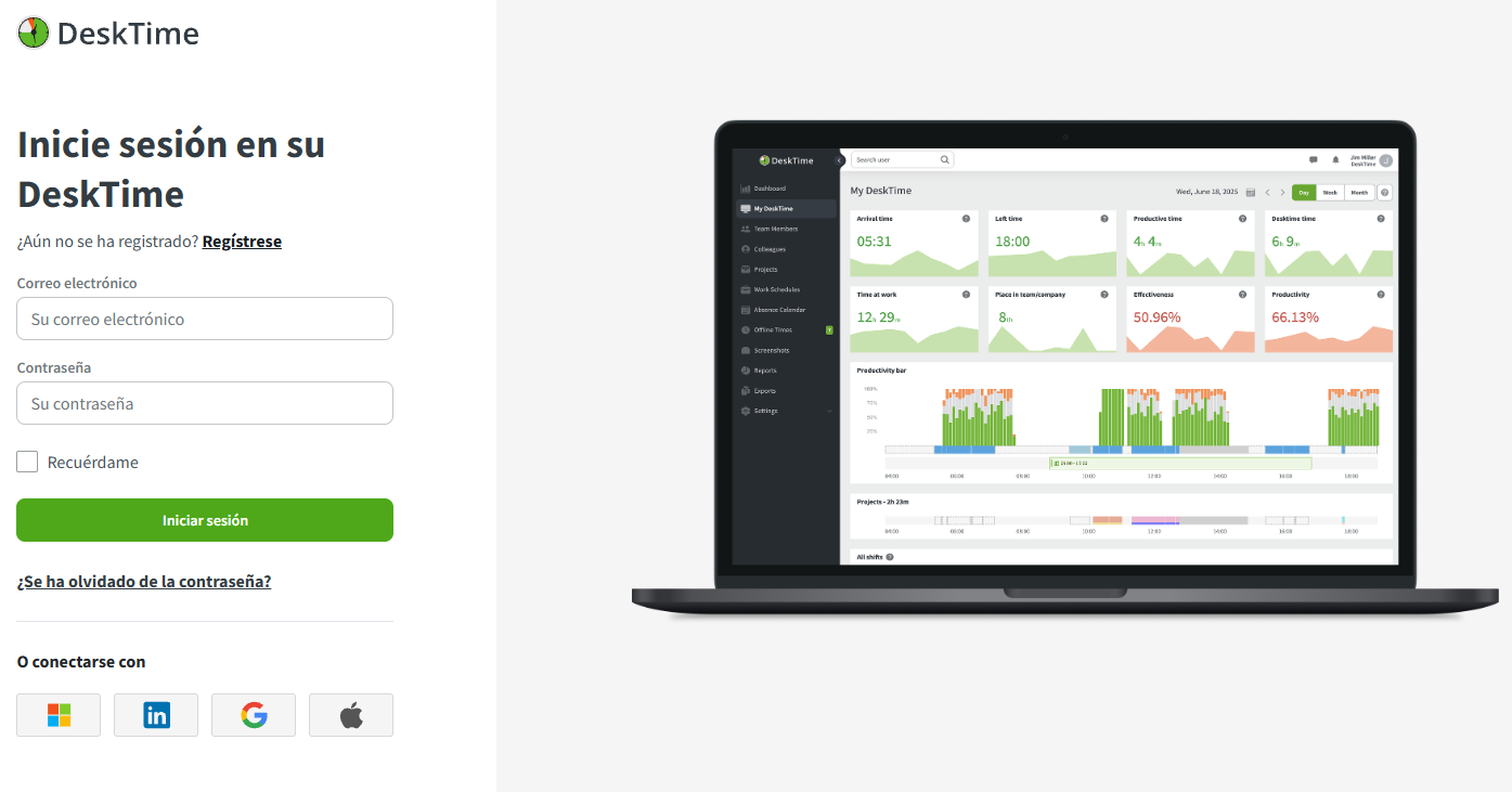 DeskTime se conecta con cuentas de Microsoft Entra ID (antes Azure Active Directory), LinkedIn, Google y Apple.