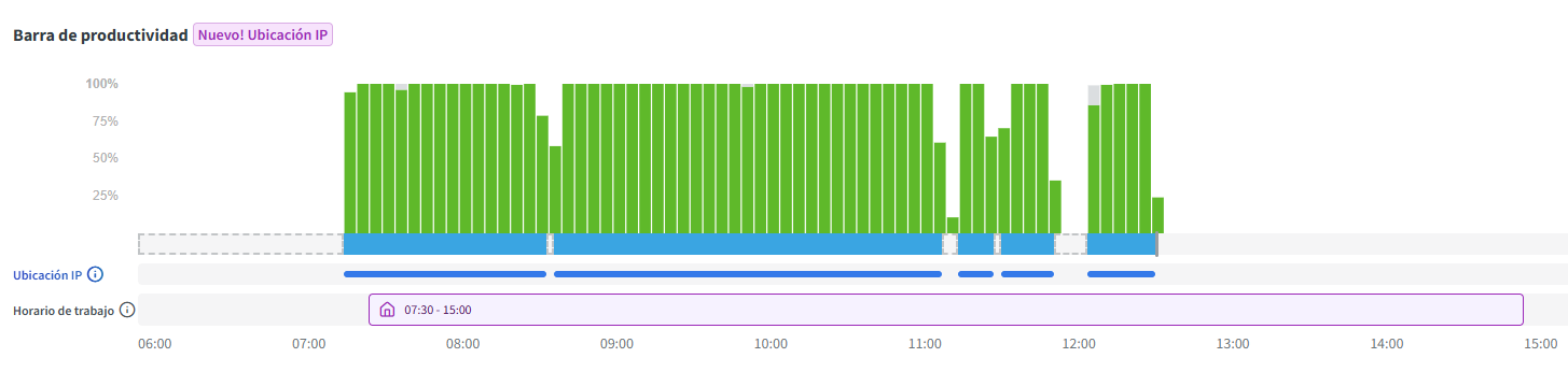 La localización de IP muestra si alguien está trabajando desde la oficina o de forma remota. Esto ocurre automáticamente, así que no hace falta marcar las ubicaciones de trabajo.