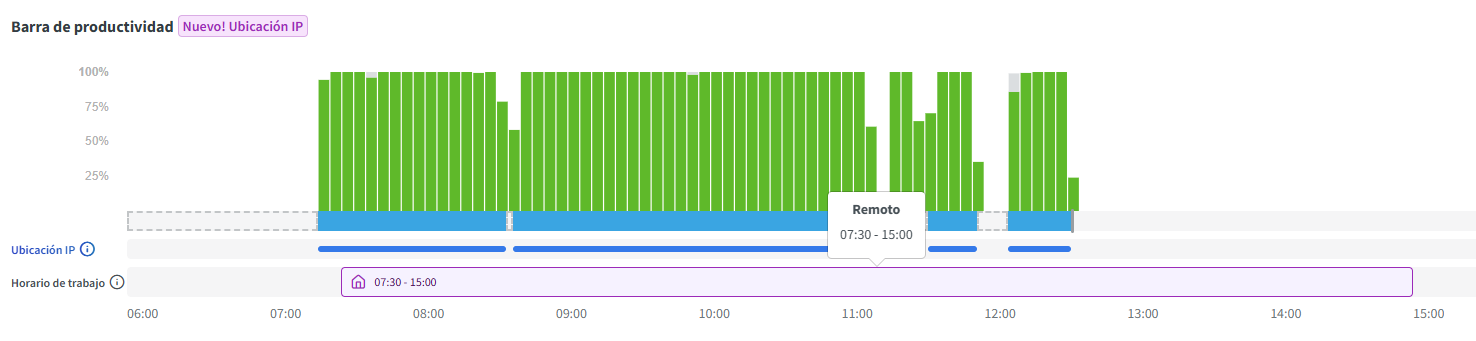 Aparece como una barra que muestra los periodos de trabajo en oficina o remotos durante el día, y se encuentra entre la barra de productividad y la barra de horarios de trabajo.