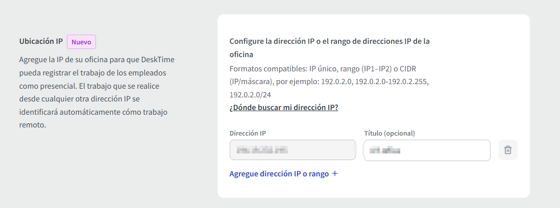 Esta función compara la dirección IP del usuario con la dirección IP de la oficina indicada en DeskTime. Si el usuario se encuentra en la red de la oficina, el tiempo se muestra como trabajo en la oficina. Sin embargo, si el usuario está conectado desde otro lugar, se muestra como trabajo remoto.