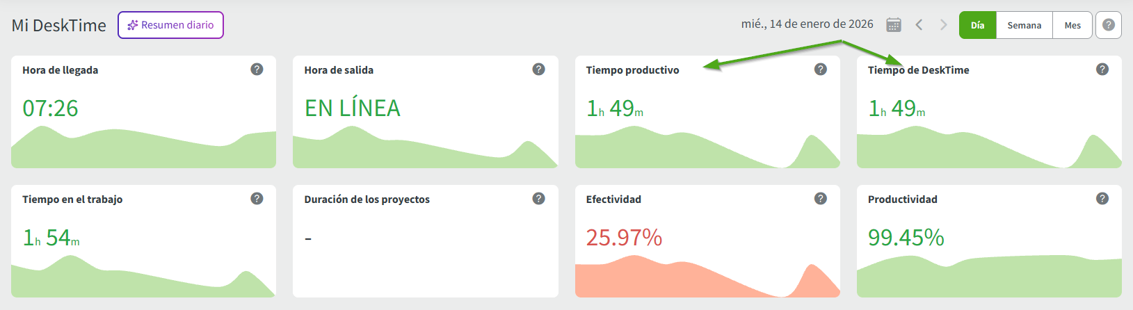 El tiempo productivo es el tiempo total dedicado a aplicaciones productivas. En resumen, no todo el tiempo dedicado a DeskTime será tiempo productivo. Pero todo el tiempo productivo puede formar parte del tiempo dedicado a DeskTime.
