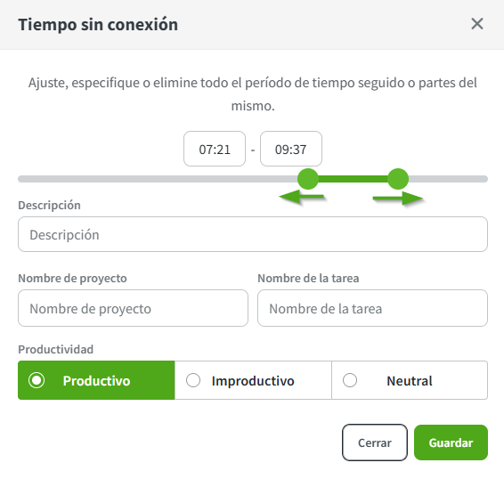 Si necesita registrar una actividad relacionada con el trabajo en su cronograma de forma manual, haga clic en un período de tiempo inactivo, introduzca una descripción para ese período y seleccione un nivel de productividad, luego guarde los cambios. Dependiendo de la configuración de la cuenta, es posible que un administrador tenga que aprobar la solicitud antes de que se añada a sus horas.
