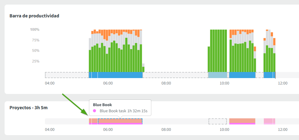 La barra de productividad muestra un desglose de su día. Todas las aplicaciones rastreadas aparecerán aquí con los colores que representan su nivel de productividad. Los vacíos en el cronograma significan tiempo de inactividad, períodos en los que ha estado alejado del ordenador o ha estado inactivo en el ordenador durante más de tres minutos (este período podría ser más largo si lo cambian los administradores).