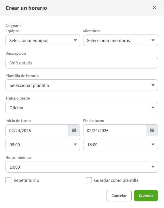Si su empresa no tiene un horario de trabajo establecido, puede utilizar esta sección para solicitar los horarios de sus turnos. Para ello, haga clic en el botón Añadir horario, o en cualquier fecha vacía del calendario de su cronograma. Se abrirá una ventana de creación de turnos.