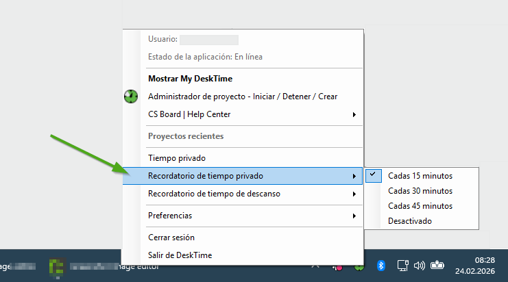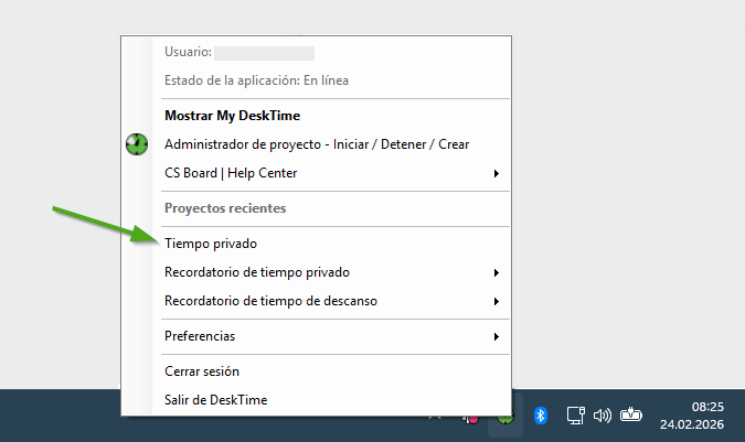 Tiempo privado: para detener temporalmente el seguimiento, haga clic con el botón derecho del ratón en el icono de DeskTime en su barra de tareas y haga clic en Tiempo privado. Mientras esté activo, todo el seguimiento se detendrá hasta que vuelva a desactivar el tiempo privado haciendo clic de nuevo en la misma opción. El icono se volverá gris durante este tiempo para recordarle que el tiempo privado está activado.