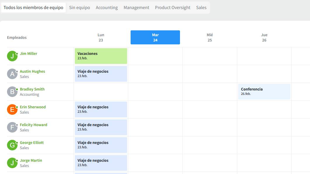 Del mismo modo, en el calendario de ausencias puede ver sus ausencias previstas y las de sus compañeros, ya sean vacaciones, días de descanso, viajes de negocios o ausencias por enfermedad.