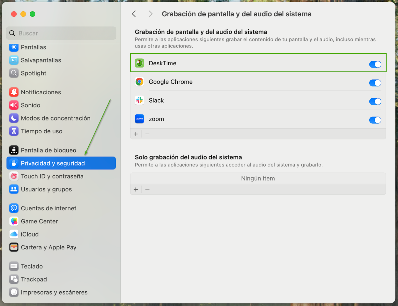 Para obtener datos precisos sobre la productividad, DeskTime necesita monitorear las aplicaciones y las páginas web que usa. En macOS, el sistema operativo impide que las aplicaciones vean los títulos de las ventanas (por ejemplo, el nombre exacto de un documento de Google Docs o la URL de una página web) y que realicen capturas de pantalla, a menos que se les haya dado permiso para grabar la pantalla.