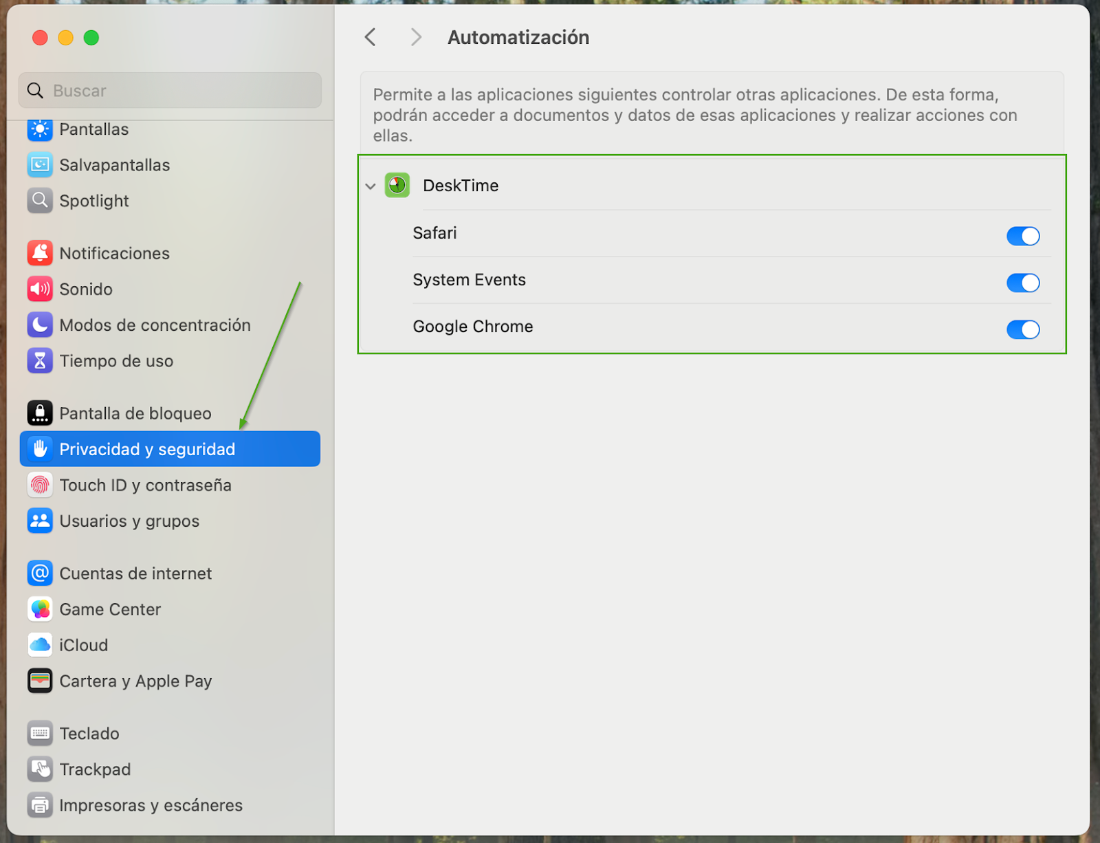 Para obtener información precisa sobre la productividad, macOS requiere permisos específicos en Ajustes del Sistema > Privacidad y seguridad. Sin estos permisos activados, DeskTime no puede distinguir entre las tareas y tampoco realizar un seguimiento preciso del tiempo de actividad.