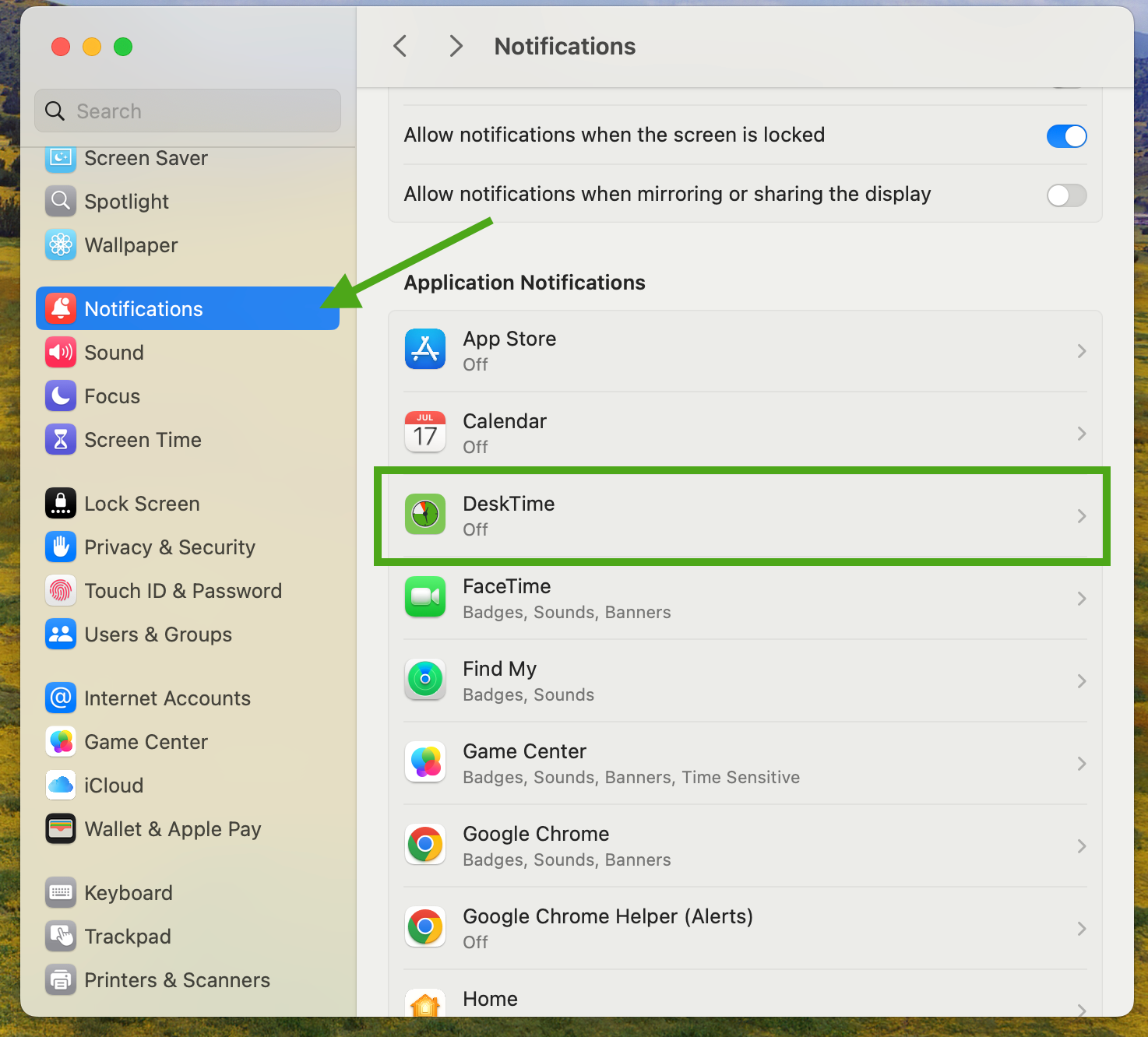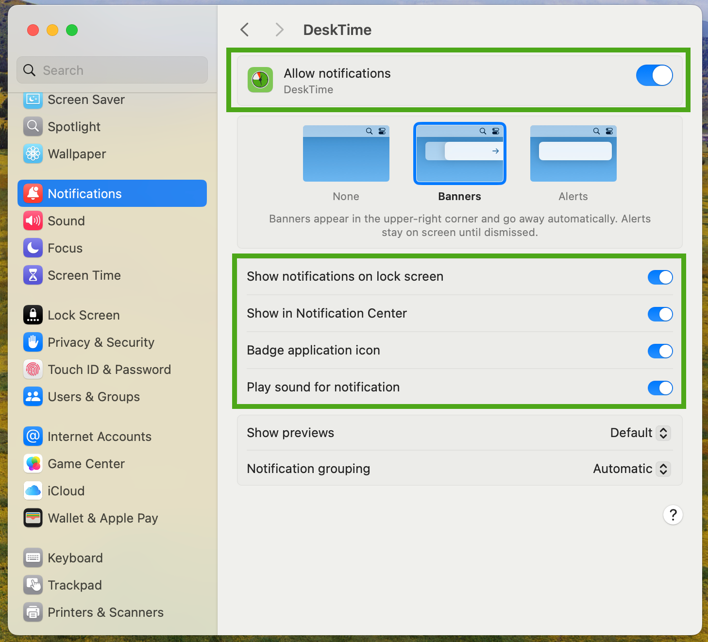 si usa No molestar o el modo Concentración, es posible que estas alertas se silencien. Le recomendamos añadir DeskTime a la lista de Aplicaciones permitidas en los ajustes de Concentración de macOS para asegurarse de que no se pierda ningún recordatorio importante.