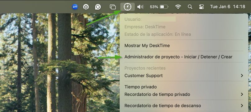 Para utilizar el cronómetro de proyectos, haz clic derecho en el icono de DeskTime en la barra de tareas -> haz clic en Administrador de proyecto - Iniciar / Detener / Crear