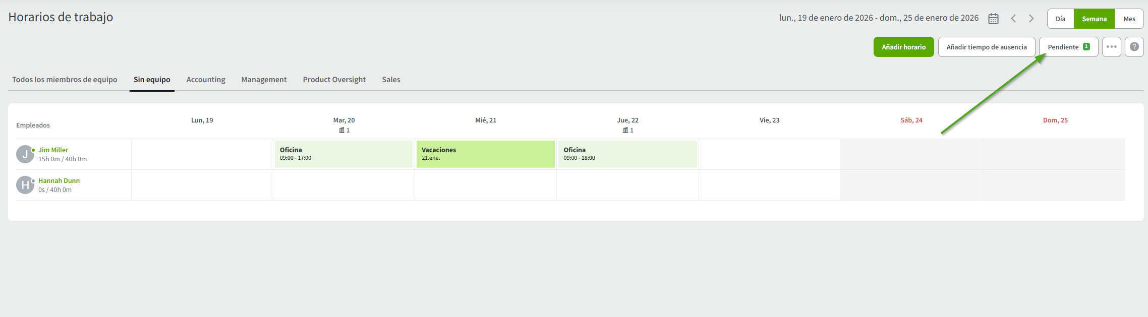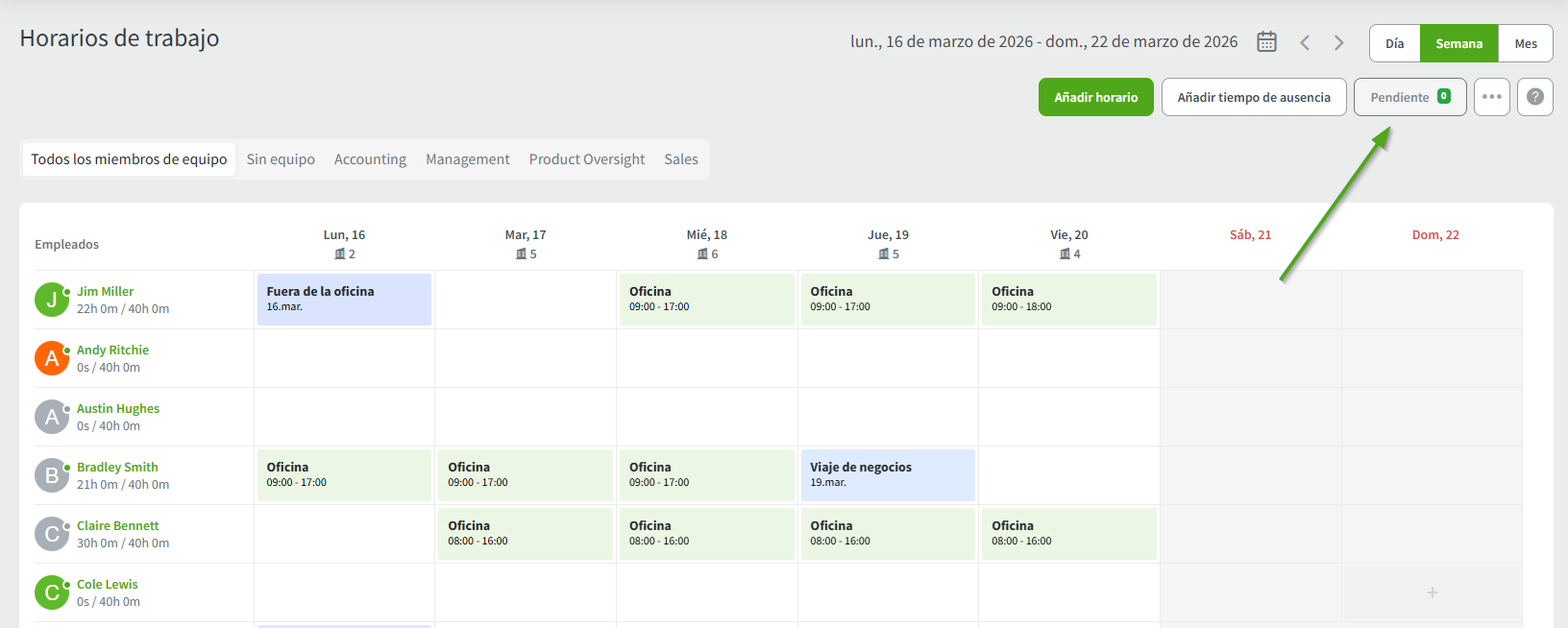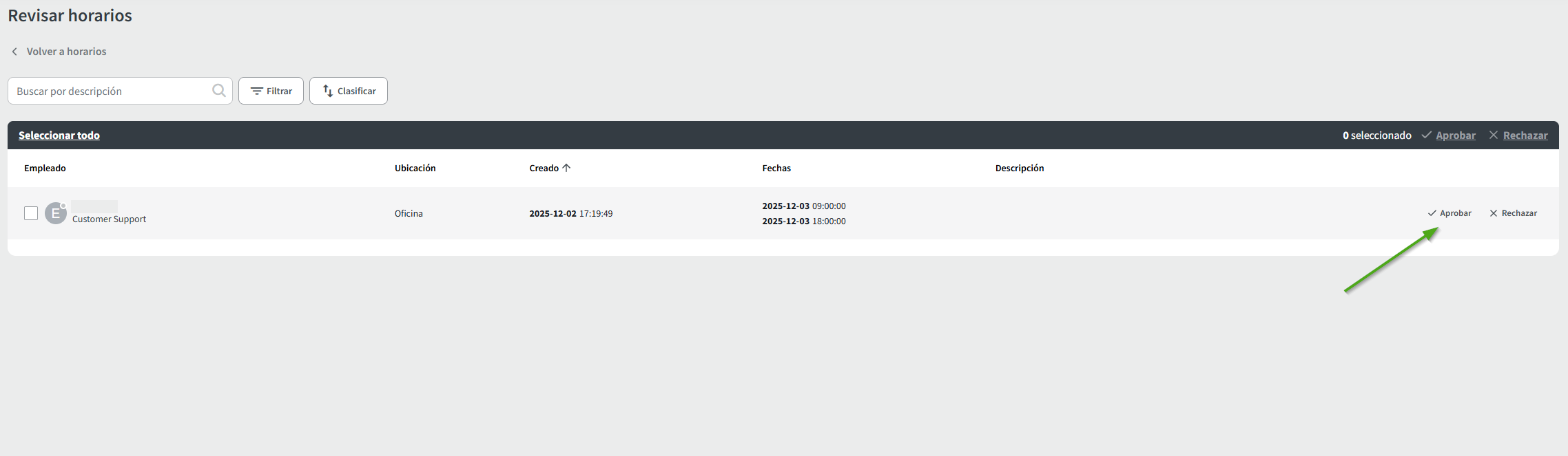 Solo el propietario de la empresa y los administradores pueden ver la pestaña Pendiente. Al hacer clic en el botón, se abrirá la página de Revisiar Horarios para aprobar o rechazar la solicitud de turno.