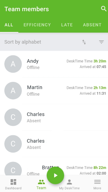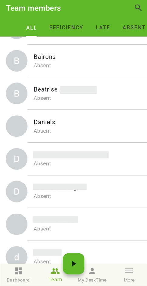 De un vistazo, puedes ver la productividad promedio de la empresa, identificar quién llegó tarde y ver quién aún no ha registrado su entrada. Al pulsar en cualquiera de estas métricas, se abrirá una lista detallada de esa categoría específica.