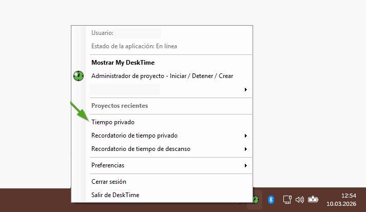 Puede verificar el estado mirando el icono de DeskTime en la barra de tareas. Cuando el tiempo privado está habilitado, el icono habitual cambiará.