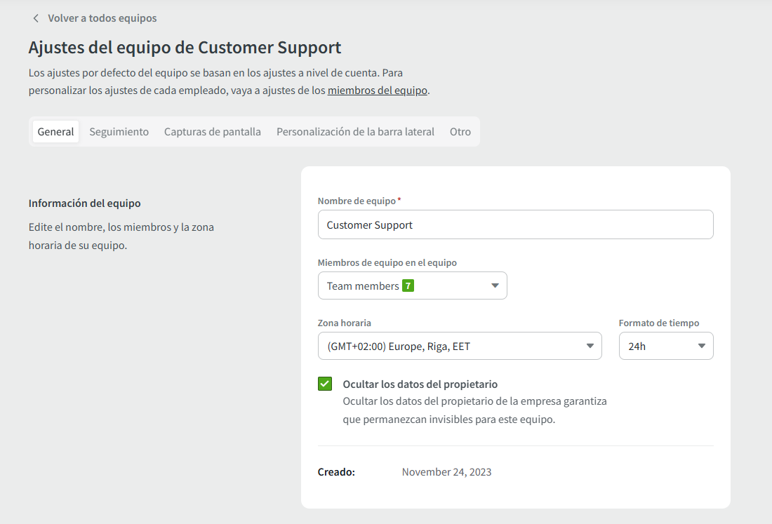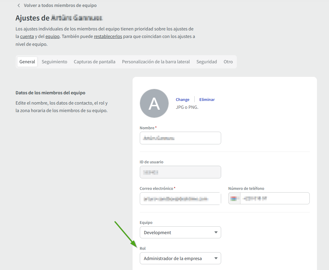 En cada nivel (Cuenta, Equipo y Miembro del equipo), puedes gestionar el Seguimiento, las Capturas de pantalla y la Navegación de la barra lateral. Además, existen otras configuraciones específicas según el rol: