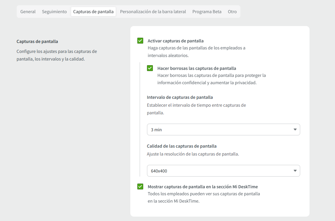 Capturas de pantalla: Activa la función, desenfoca las imágenes y define la calidad y frecuencia de las capturas. Recuerda que puedes habilitar las capturas en tu página de MyDeskTime haciendo clic en Mostrar capturas de pantalla.