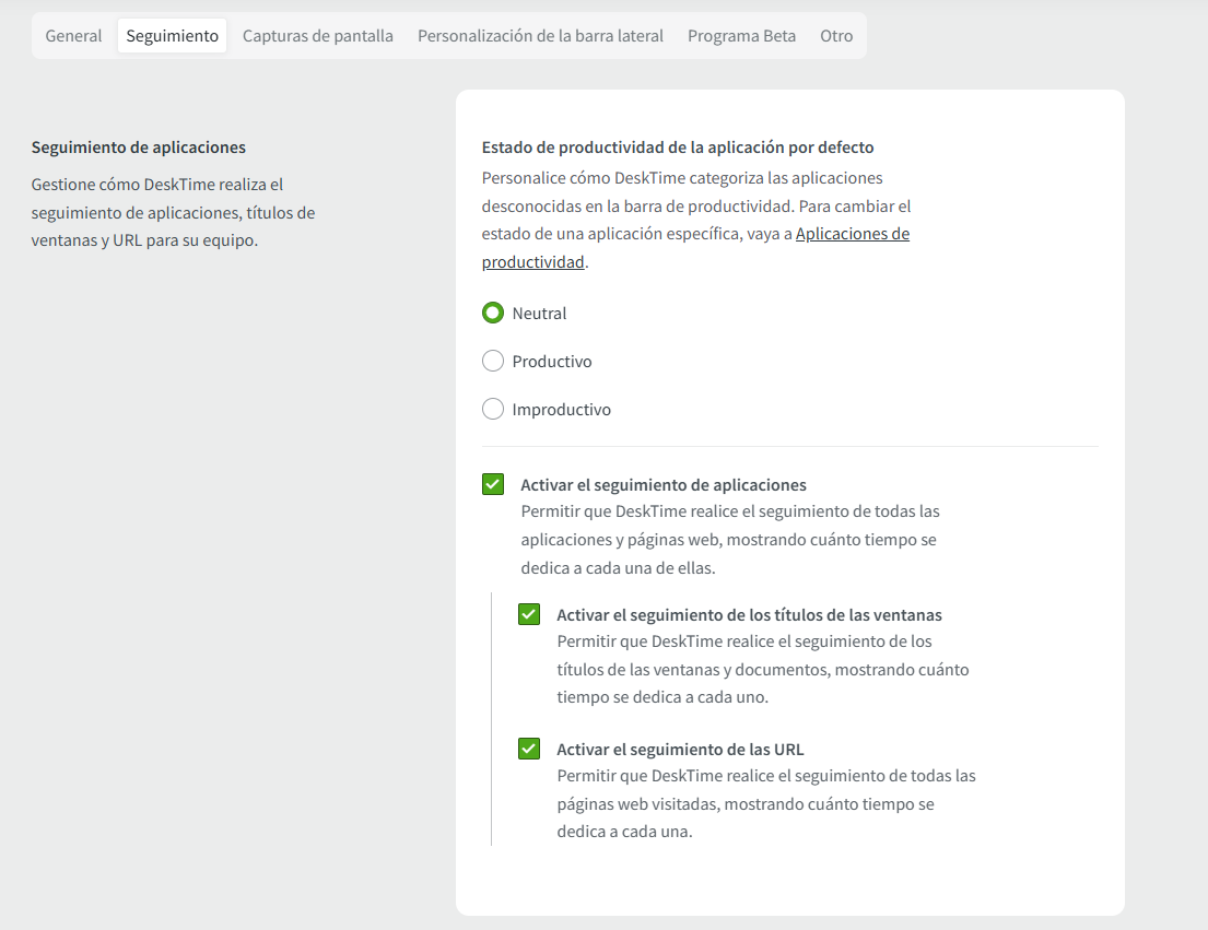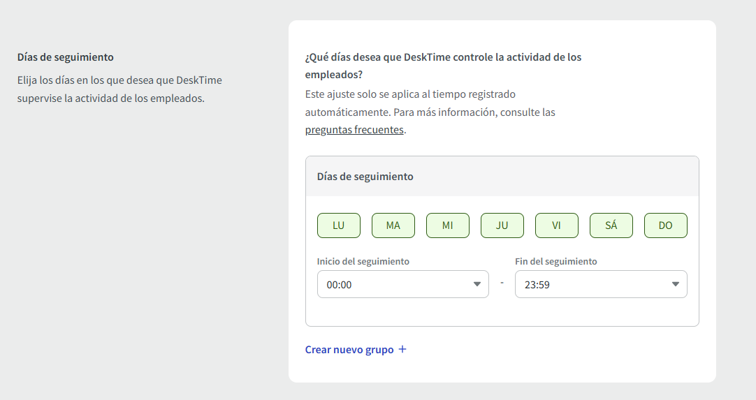 Días de seguimiento: Selecciona el horario en el que DeskTime registrará los datos de los usuarios. La aplicación no registrará ninguna actividad fuera de las horas o días asignados.