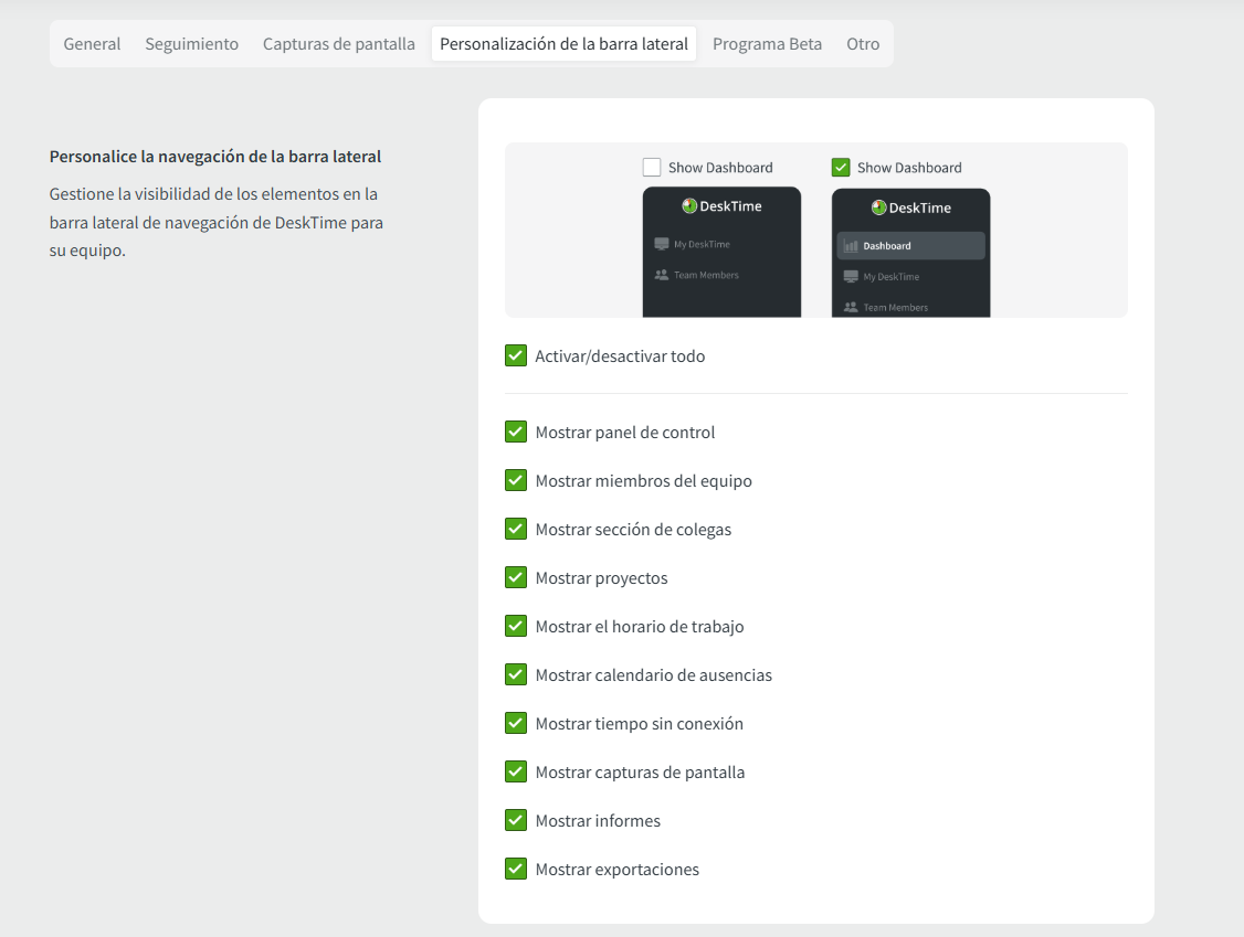 Personalización de la barra lateral: Activa o desactiva las funciones que aparecen en el menú lateral de tu equipo para mantener su espacio de trabajo limpio y relevante.