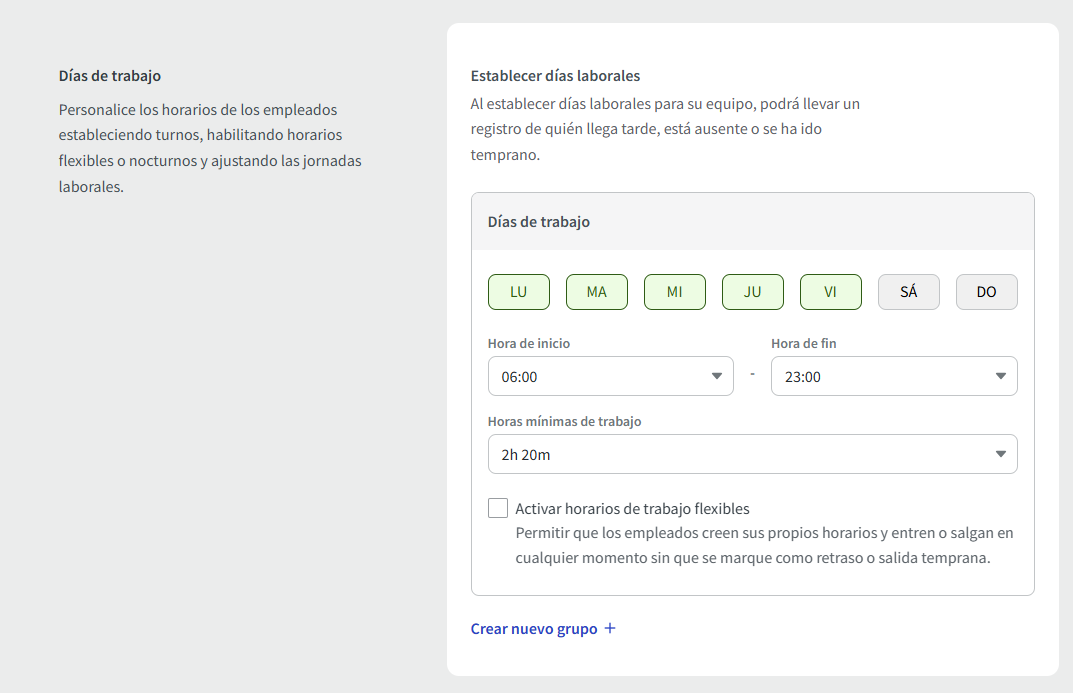 Días laborables: Define un horario de inicio y fin de jornada, y asigna el mínimo de horas que los usuarios deben trabajar activamente en el ordenador durante el día.