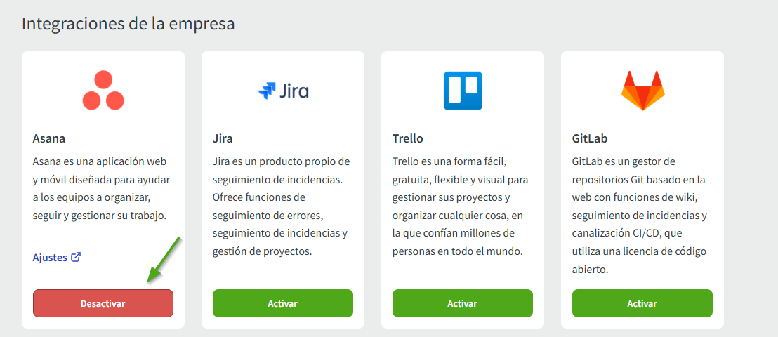 Para desconectar su integración con Asana, vaya a Ajustes y luego a Integraciones. Después, haga clic en deactivar integración:
