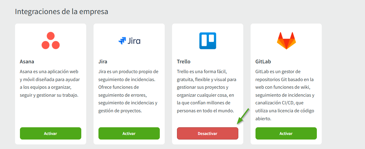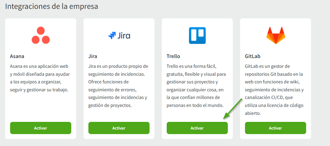 2. Busque la integración de Trello en la segunda fila de integraciones de empresa y pulse Activar: