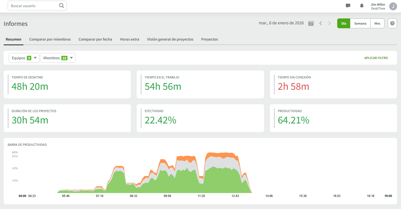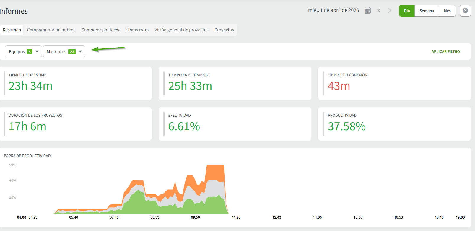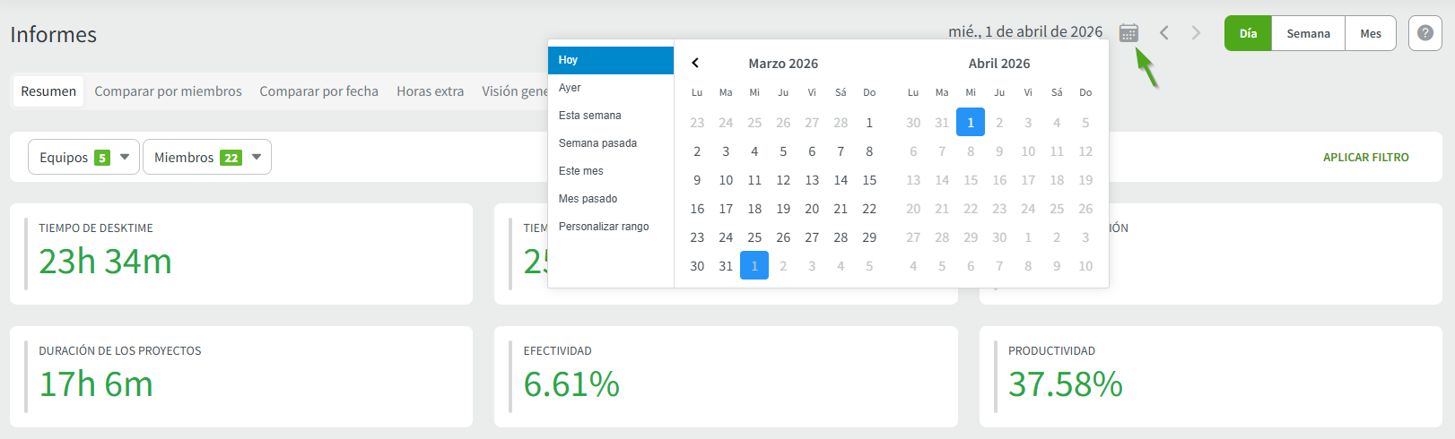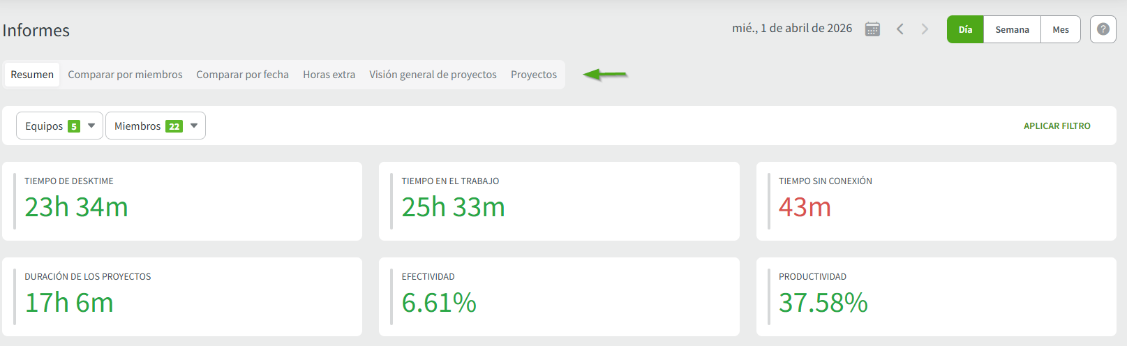 En la sección Informes, puede elegir ver un informe de cualquier día, semana o mes. Podrá consultar diferentes estadísticas. Estas serán las estadísticas promedio de toda su cuenta DeskTime y puede utilizar esta información para ver las tendencias en su productividad o hábitos de trabajo.